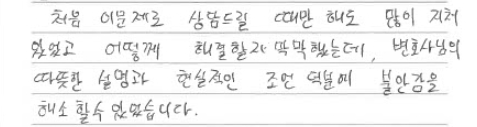 "처음엔 어떻게 해결할지 막막했는데, 변호사님의 따뜻한 설명과 현실적인 조언 덕분에 불안감을 해소할 수 있었습니다."